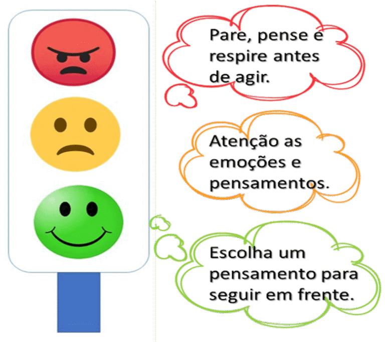 Semáforo das Emoções O Semáforo das Emoções é uma ferramenta para ajudar no autocontrole e na regulação emocional. Ele transforma o processo de perceber e lidar com as emoções em algo visual e fácil de entender. Como funciona 🔴 Vermelho – Pare! Representa momentos de emoções desagraveis: raiva, irritação, frustação e medo. O corpo dá sinais (coração acelerado, respiração ofegante,
